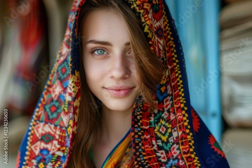 beauty, woman, fashion, girl, portrait, face, blue, fabric, hand-made, smiling, design, culture, young, pattern, colourful, craft, hair, close, happy, up, youth, textile, style, vibrant, traditional, eye, costume, decorative, detail, tradition, brown, clothing, ethnic, serene, headscarf, colours, artisan, head, embroidery, ethnicity, ornate, innocence, expression, heritage, cultural, rich, shoulder, bohemian, folk