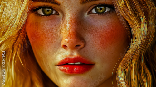 Portrait of a beautiful young woman with blonde hair, red lips, and freckles.