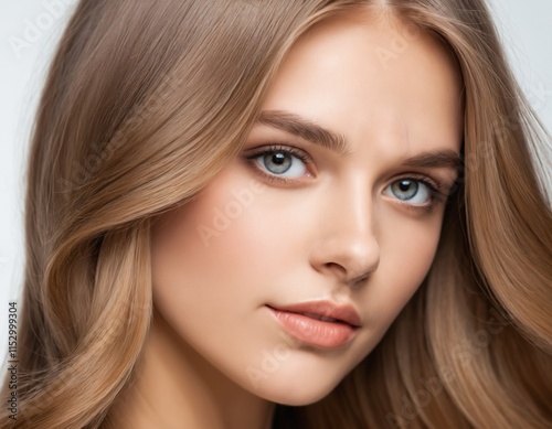 Portrait of a beautiful young woman with clean, fresh skin and long, thick hair. ai generator