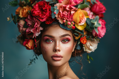 Portrait of a beautiful young woman with curly hair and perfect skin wearing a wreath of colorful flowers on her head