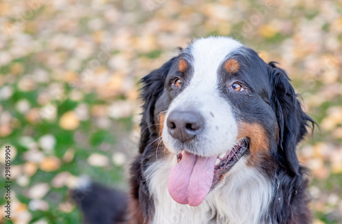Portrait of a Berner Sennenhund dog in autumn park
