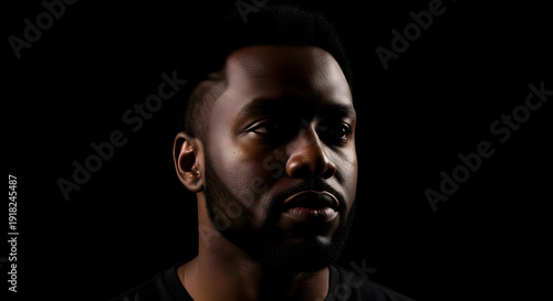 man, black, portrait, face, dark, background, human, person, skin, male, model, adult, look, eye, mood, shadow, light, low, key, depth, serious, strong, calm, peace, soul, spirit, art, photo, studio, head, shoulder, neck, hair, shave, clean, profile, front, classic, elegant, modern, style, fashion, beauty, life, story, being
