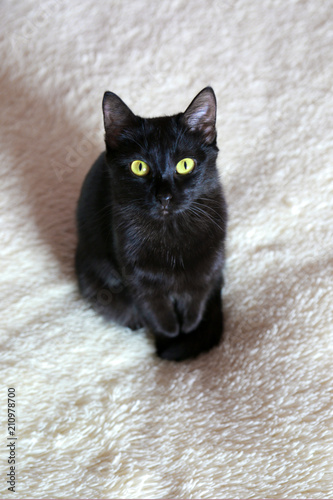 Portrait of a black Shorthair cat. The cat looks at the camera with a stern look.