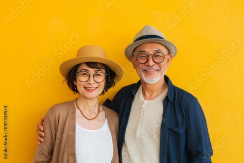 Portrait of a blissful asian couple in their 40s donning a classic fedora isolated on pastel yellow background