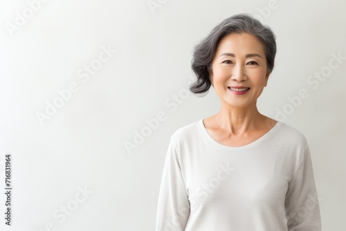 Portrait of a blissful asian woman in her 60s showing off a lightweight base layer against a minimalist or empty room background. AI Generation