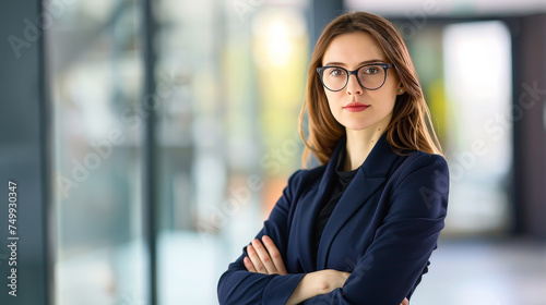 Portrait of a businesswoman with confident and friendly facial expression and her arms crossed in front of blurred office background. Generative AI