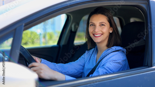 Portrait of a cheerful businesswoman driving her car and smiling at the camera
