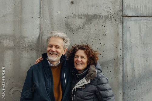 Portrait of a cheerful caucasian couple in their 50s wearing a functional windbreaker over bare concrete or plaster wall
