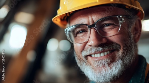 Portrait of a cheerful elderly construction worker wearing a yellow hardhat and safety glasses smiling confidently at the He has a gray beard and mustache