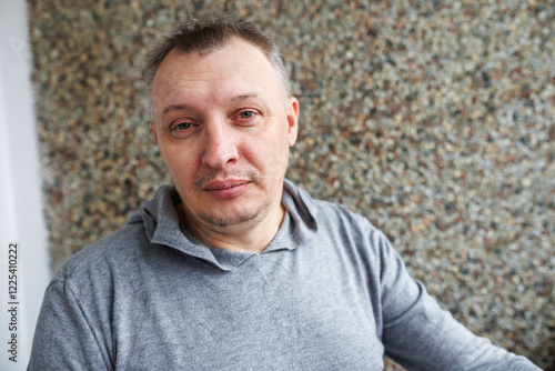 Portrait of a cheerful middle-aged man wearing a gray hoodie, standing against a textured stone wall in natural light.