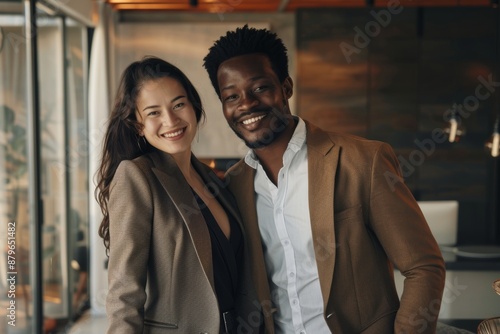 Portrait of a cheerful multiethnic couple in their 20s dressed in a stylish blazer over modern minimalist interior