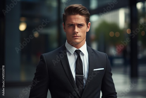Portrait of a confident businessman wearing suit and tie in a modern city environment