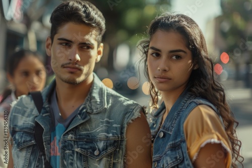 Portrait of a content latino couple in their 20s wearing a rugged jean vest in busy urban street