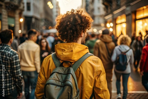 Portrait of a curly-haired mulatto traveler in a yellow jacket and with a backpack in the city. Traveling alone is a lifestyle. A young tourist is enjoying his autumn vacation.