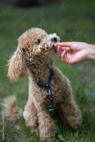Portrait of a cute caramel mini poodle on a green background. Portrait of a cute caramel mini poodle on a green background. The owner feeds the dog from her hand.