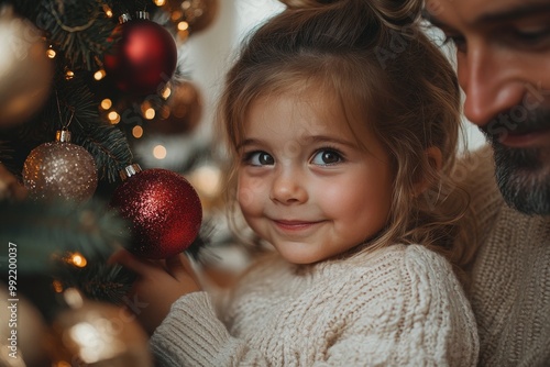 Portrait of a cute little girl decorate the Christmas tree with red balls. Christmas tree at home.