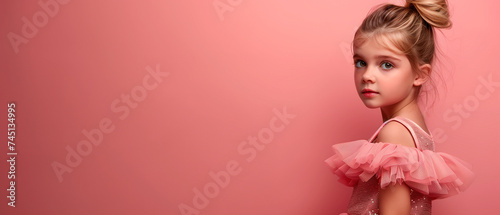 portrait of a cute little girl in a pink dress on a pink isolated background