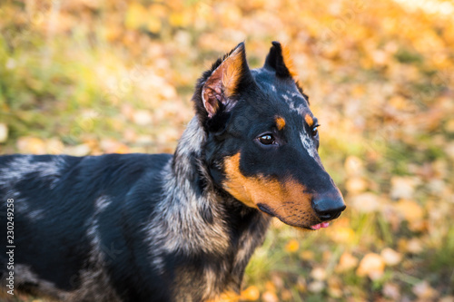Portrait of a dog breed of French sheepdog on a background of autumnal nature.