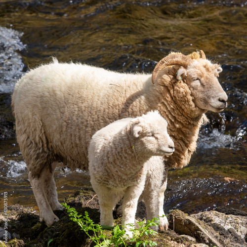 Portrait of a ewe and a lamb standing on a rock on a riverbank