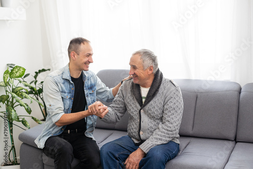 adult, care, casual attire, caucasian, family, father, grey, human, life, lifestyle, male, mature, eltern, people, senior, sitting, son, togetherness, 2, affectionate, ageing, bonding, cheerful, clothing, confidence, embracing, emotion, expression, friendship, hair, happiness, head, horizontal, indoor, looking, love, man, mid, only, portrait, positive, real, retirement, satisfaction, shoulder, smile, trust, year