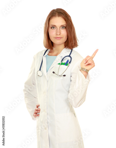 Portrait of a female doctor, pointing up