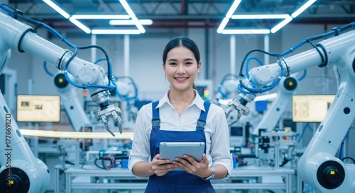 engineer, woman, factory, robotic, technology, automation, industry, manufacturing, tablet, technician, machinery, asian, men at work, production, control, modern, arm, equipment, professional, future, innovation, system, assembly line, female, operator, specialist, computer, device, programming, monitoring, smiling, portrait, high technology, futuristic, plant, workplace, assembly line, artificial intelligence, science, development, efficiency, person