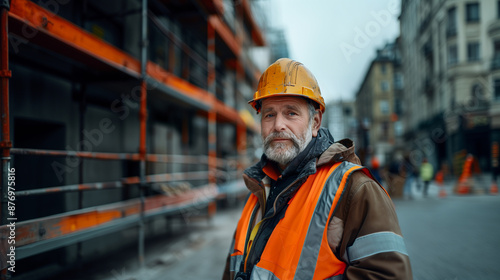 Portrait of a foreman or worker against the backdrop of a construction site. Construction site manager wearing a hard hat and safety vest. A satisfied manager looks at the camera. AI generative