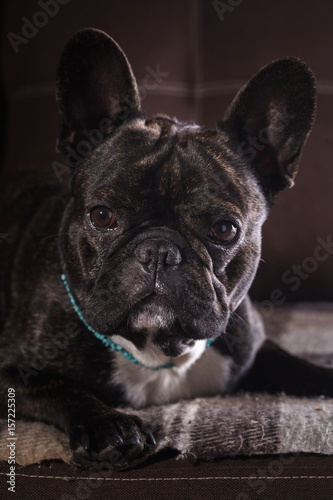bulldog, dog, french, animal, background, young, black, pet, domestic, house, interior, sofa, relax, portrait, breed, pedigreed, funny, lying, cute, looking, 1, shot, mammal, ear, brindle, nobody, view, cut, wrinkly, canino, vertebrate, closeup, attentive