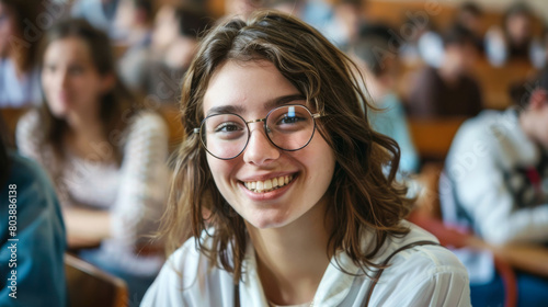 Portrait of a French caucasian happy university female student sitting in a college lecture hall