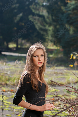 Portrait of a girl in an autumn park against a background of yellow foliage. Blurred background. Selective focus.