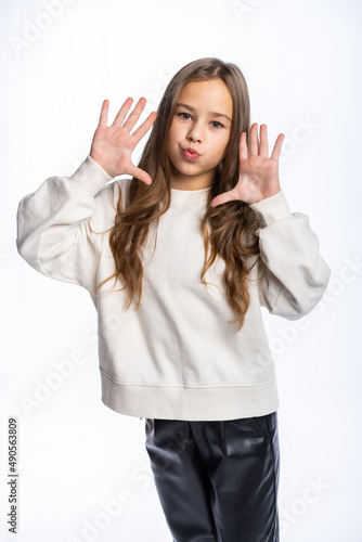 portrait of a girl in the studio. beautiful little girl in a white sweatshirt and trousers is smiling. isolated white background