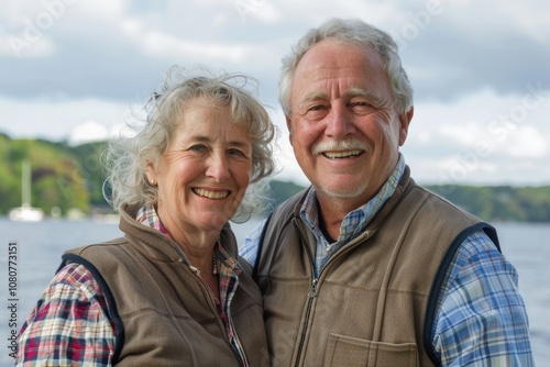 Portrait of a glad couple in their 50s dressed in a polished vest in front of serene lakeside view