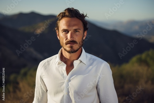 Portrait of a glad man in his 30s wearing a classic white shirt against a backdrop of mountain peaks. AI Generation