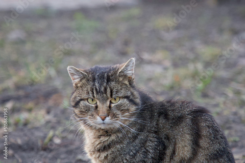 Portrait of a gray domestic cat. The cat is sitting on the grass