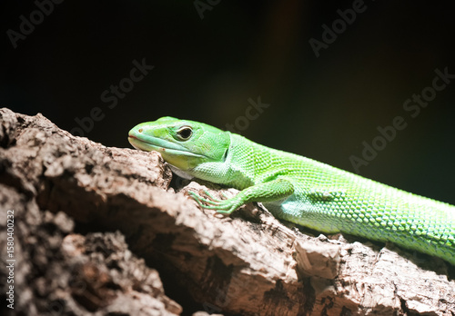 Portrait of a green tree lizard. Close-up of a reptile in its natural habitat.