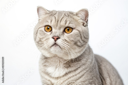 cat, grey, portrait, animal, pet, domestic, felino, eye, gold, curious, expression, white, background, studio, closeup, isolated, mammal, whisker, soft, fur, tabby, british, short hair, scottish, fold, kitten, cute, adorable, fluffy, lover, owner, care, food, toy, bed, litter, grooming, health, behaviour, adoption, rescue, shelter