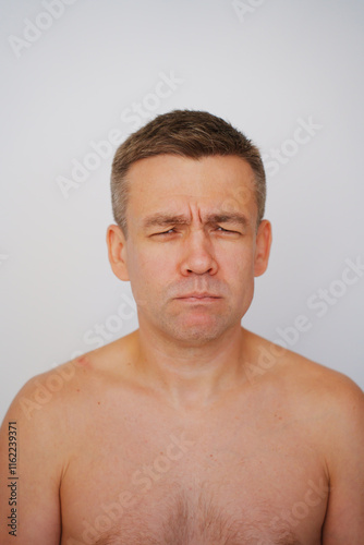 Portrait of a grimacing middle-aged man with a naked torso on a white background. photo posing. men's physical and mental health