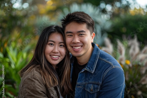 Portrait of a grinning asian couple in their 20s sporting a rugged denim jacket while standing against lush green garden