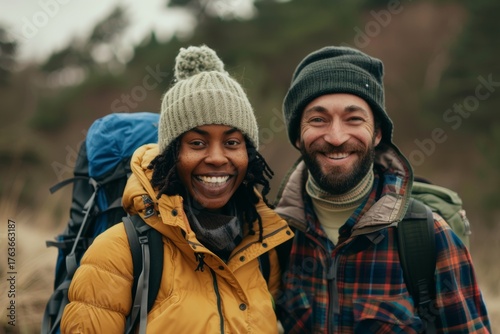 Portrait of a grinning multiethnic couple in their 30s going on a hike in nature