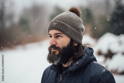 Portrait of a handsome bearded man with a long beard and mustache in a knitted hat in the winter forest on a snowy day