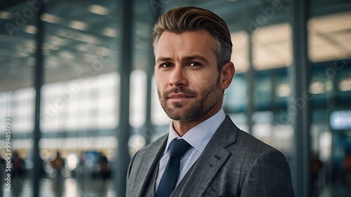 Portrait of a handsome businessman looking out of a glass wall at an airport