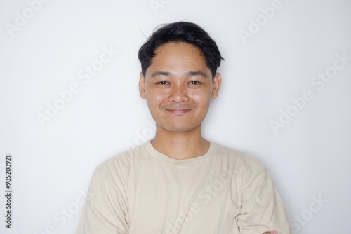 portrait of a handsome Indonesian man posing randomly wearing a Cream shirt on a white background isolated