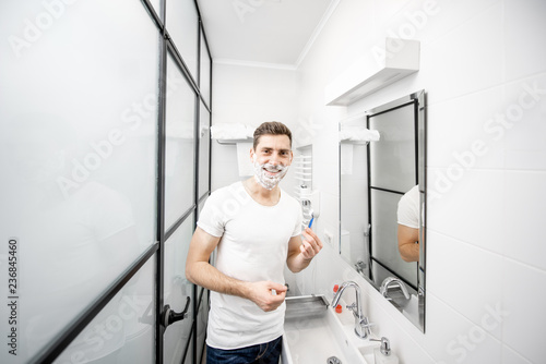 Portrait of a handsome man in white t-shirt shawing with blade and foam in the bathroom