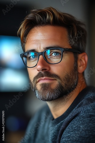 man, portrait, goggles, face, eye, hair, beard, stubble field, photogenic, attractive, model, adult, male, person, human, guy, expression, serious, confident, thoughtful, looking, gaze, sharpened, closeup, head shot, indoor, studio, lighting, style, fashion, casual attire, apparel, clothing, shirt, sweater, grey, blue, background, blur, depth, field, sharp, image, photo, picture