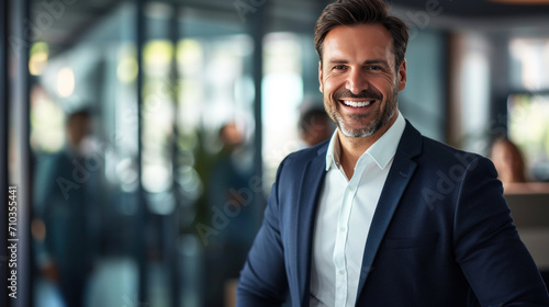 Portrait of a handsome smiling businessman boss standing in his modern business company office.