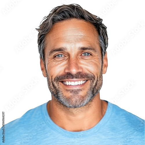 Portrait of a handsome smiling man with salt and pepper hair and beard wearing a blue t-shirt isolated on a white background happy cheerful middle aged male with genuine smile successful confident