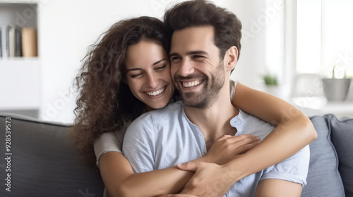 Portrait of a happy couple hugging and smiling at home, sitting on the couch in the living room.