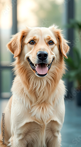 dog, gold, retriever, pet, animal, mammal, fur, creamy, beige, coat, happy, smiling, portrait, canino, friendly, playful, adorable, sweet, cheerful, content, joyful, paw, eye, mouth, tongue, expression, fluffy, warm, light, natural, relaxed, calm, gentle, loving, companion, faithful, trustworthy, purebred, domestic, house, home, cute, doggy