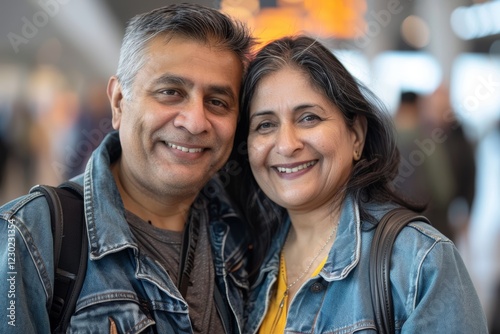 Portrait of a happy indian couple in their 40s sporting a rugged denim jacket in front of bustling airport terminal background
