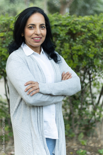 Portrait of a happy Indian woman arm crossed relaxing, spends time having fun, enjoying carefree life, smile looking. Beautiful woman spending time, Happy mood, leisure time